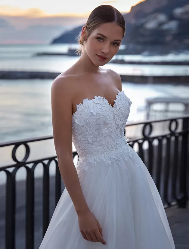 Incantevole abito da sposa scivolato in organza off white co corpino di pizzo smanicato e scollo a cuore. Il ramage è di pizzo tone sur tone è moderno e iper delicato