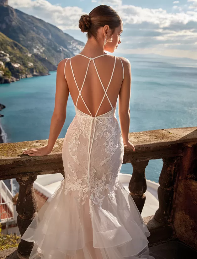 Favoloso abito da sposa a sirena moderno con ruches di tulle rosa cipra e ricami di pizzo e sequins preziose. La schiena è aimpreziosita con un icnorcio di spalline geometrico e unico a cui non potrai resistere!