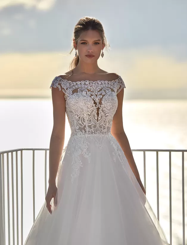 Abito da sposa romantico con gonna in tulle off white linea ad A e un delizioso corpino di pizzo con scollo a barchetta. Il dettaglio floreale sulla schiena è meraviglioso!