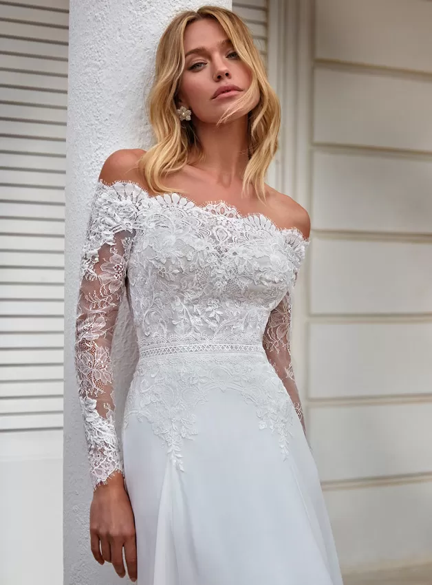 Sensuale abito con corpetto in pizzo e scollo a barca con spalle scoperte e maniche lunghe semitrasparenti. Un modello con gonna fluida in chiffon decorata da una cintura in guipure.
