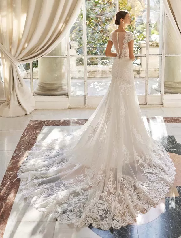 Esalta le tue curve con l’abito da sposa sirena Aldo. Il corpetto in pizzo si apre in un profondo scollo sensuale, con maniche ad aletta e schiena in tessuto effetto illusione di tulle plumetis. Culmina in un lungo strascico ed è perfetto per una cerimonia civile in autunno.